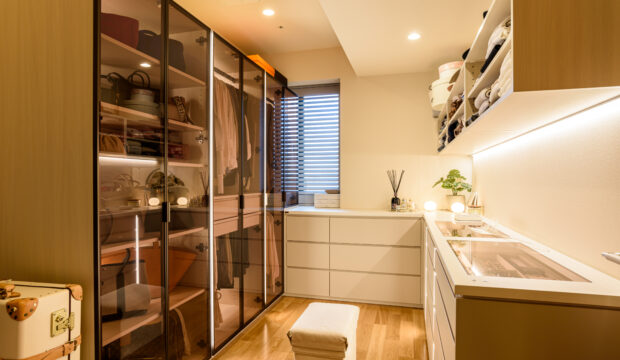 上下棚の奥行きやオープンスペースのサイズをご要望に合わせて設計し、バランスのとれた壁面収納となりました。また、全体の統一感を感じられるよう、オープンスペースには同色のバックパネルを使用しております。