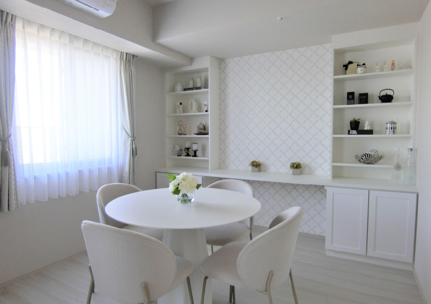 シンプルな中にも小さなこだわりが詰め込まれた家具に仕上がりました。ホワイトの框扉は、I様に選定いただいたアクセントクロスとも相性良く、エレガントな印象に。お気に入りの小物達をディスプレイできる展示棚は、暮らしを華やかに魅せてくれる特別なスペースになりました。I様のセンスで作り上げられたモデルルームのような空間を拝見でき大変光栄です。今後とも末永くご愛用頂けますこと心より願っております。素敵なご縁をいただき誠にありがとうございました。
